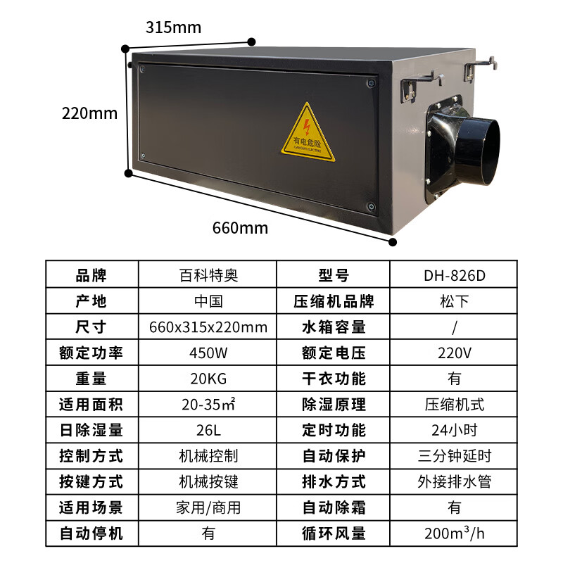 The Baikao Teao Duct Dehumidifier operates on the refrigerant dehumidification principle. The machine's design can be customized according to the user's installation requirements, featuring various sizes, shapes, and multi-stage air volume control. It is widely used for process dehumidification, where products are not exposed, and is particularly suitable for villas, assembly halls, office buildings, hospital complexes, saunas, and other spaces for dehumidification. It also excels in bathroom dehumidification, heating, and drying. The Baikao Teao Duct Dehumidifier is available in two installation types: suspended and floor-standing; and in two dehumidification types: fresh air and constant air.