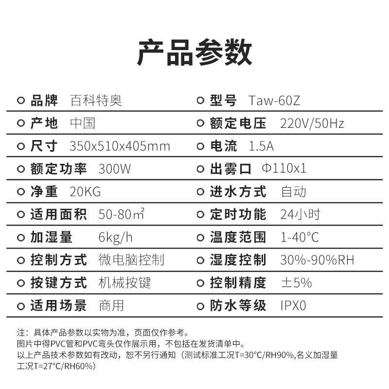 The百科特奥ultrasonic industrial humidifiers utilize electronic ultra-frequency vibration (vibration frequency of 1.7MHz, beyond the range of human hearing, harmless to humans and animals) to throw water away from the surface through the high-frequency resonance of the atomizing plate, creating a natural,飘逸 water mist. No heating or chemicals are needed to produce 1-10μm water particles floating in the air, achieving air moistening. Additionally, an appropriate relative humidity is crucial for improving product quality, reducing waste rate, preventing static electricity, eliminating dust, purifying air, and enhancing the environment.