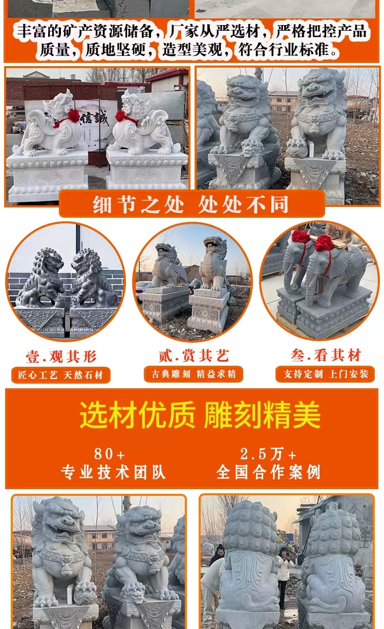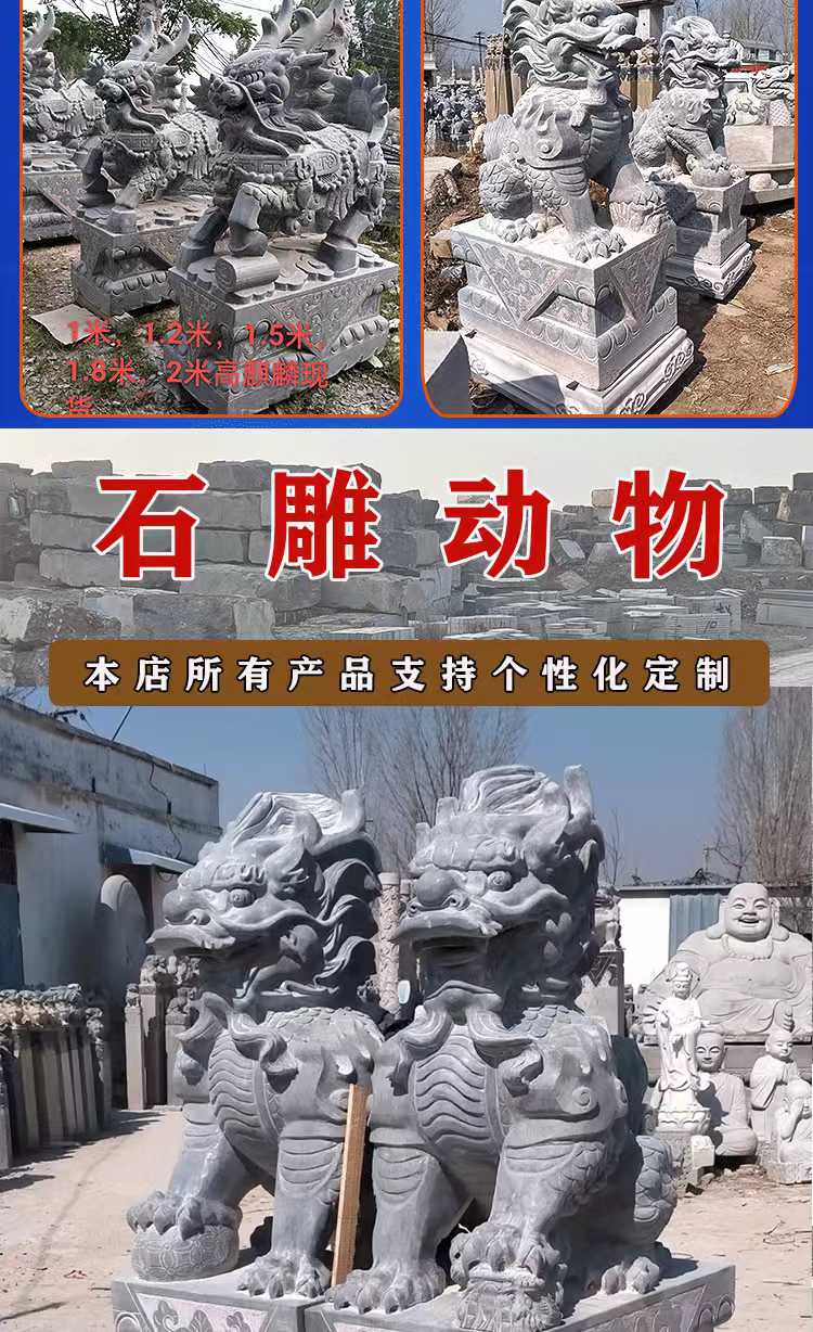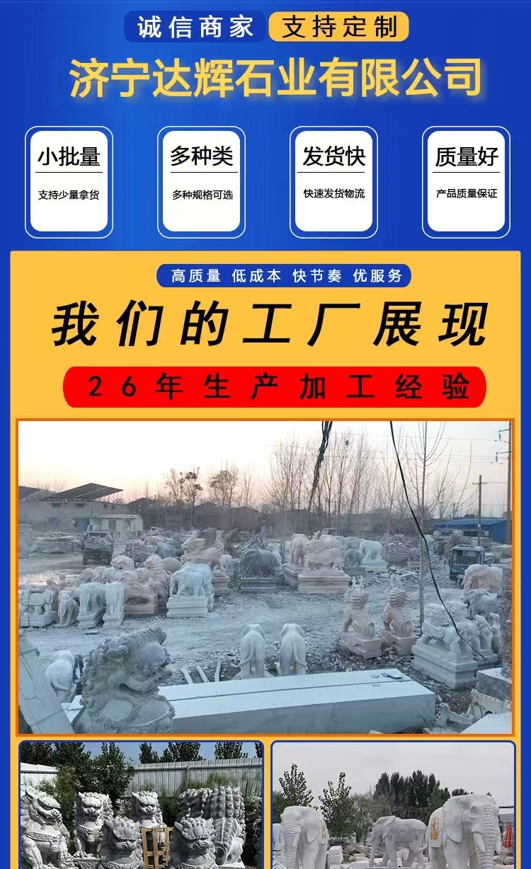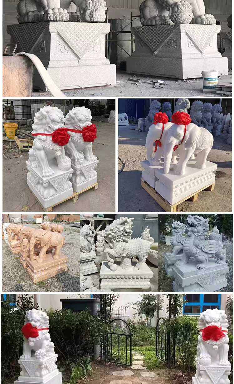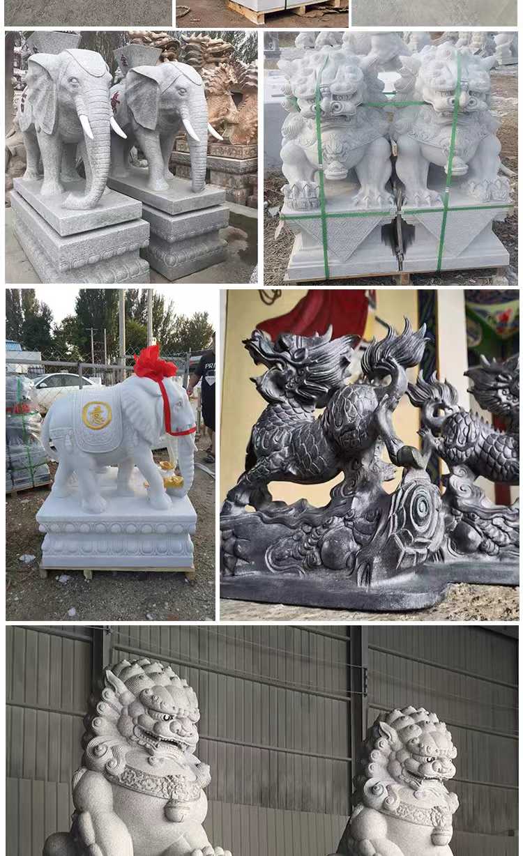 Animal sculptures are artistic creations that blend cultural significance with symbolic meaning. They embody the symbolic significance of animals across different cultures—such as the dragon representing majesty, the lion symbolizing protection, and the crane signifying good fortune—and precisely capture the morphological features and dynamic essence of animals through techniques like round sculpture, bas-relief, and openwork. These sculptures seamlessly integrate the art of sculpture with the beauty of nature, offering both aesthetic appeal and cultural expression. Materials commonly used include bluestone, granite, marble, and bronze. Bluestone is ideal for showcasing an ancient, heavy texture and can finely depict the hair and texture of animals. Granite is hard and resistant to outdoor erosion, making it suitable for outdoor settings. Marble has a pure and soft color that highlights the delicate feel of animal shapes. Bronze, with its metallic luster and historical depth, is perfect for creating grand animal figures. The production process involves conceptualization, design, model making, material processing, fine carving, and surface polishing. Craftsmen adjust techniques based on the animal's characteristics and material properties to ensure lifelike and natural sculptures. Their applications are vast, from gardens and landscapes to enhance dynamic atmospheres, like stone lions in courtyards or stone carvings of koi fish by ponds. They can also be used in urban squares or parks as public art installations to enrich spatial layers. Additionally, they can be placed around temples or ancient buildings to convey auspicious meanings and cultural heritage. They can also be used in home gardens as decorative pieces to elevate the space's style. With high-quality materials and exquisite craftsmanship, animal sculptures offer advantages such as resistance to weathering, wear, and a long service life. They can serve as cultural symbols to convey auspicious meanings and as artistic decorations to illuminate various spaces, making them classic products that combine artistic value and practical functionality.