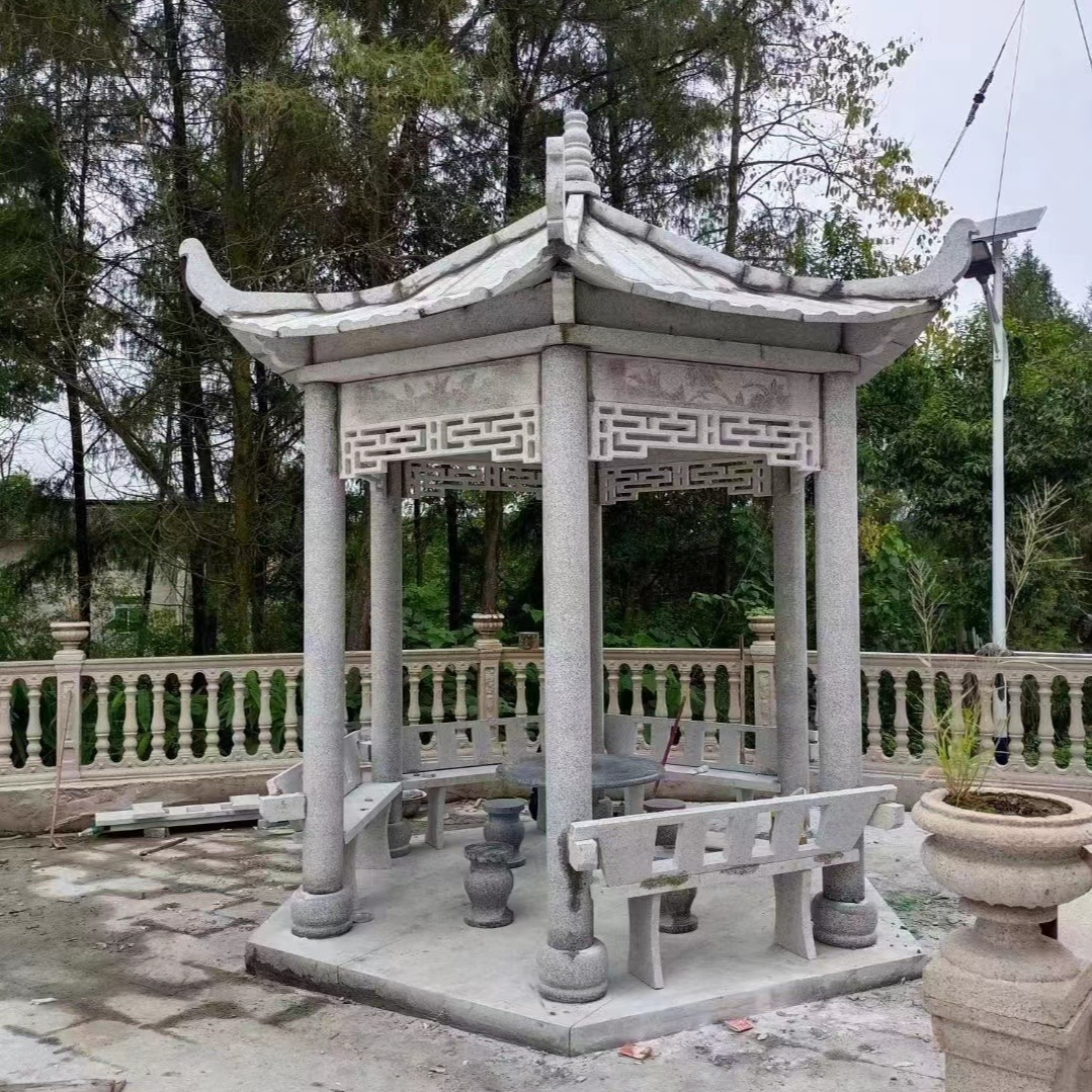 Stone pavilions are traditional landscape structures that blend the artistic conception of Chinese gardens with practical functions. Designed around the core concept of "a pavilion is a place to stop," they not only serve the practical purposes of "providing shade and shelter from rain, and a place to pause and view the scenery," but also embody the aesthetic philosophy of Chinese architecture, which is "delicate, compact, and harmonious with nature." Often, they are highlighted by the skillful combination of columns, beams, and roofs (such as upturned roofs or resting roofs), paired with bas-relief and openwork carvings that depict flowers, birds, landscapes, and auspicious patterns, turning the structure itself into a landscape highlight. In terms of material selection, high-quality stones like bluestone, granite, and marble are commonly used. Bluestone brings an ancient, smooth texture, fitting well with traditional garden styles. Granite is hard, resistant to weathering and abrasion, suitable for long-term outdoor use, while marble has a pure color that enhances the building's refinement. The production process involves site selection and design (determining dimensions and shapes based on the surrounding environment), stone processing (cutting and fine carving of components), and assembly (using mortise and tenon joints or reinforced steel to ensure structural stability). Craftsmen adjust the specifications of the pavilion (such as four-column pavilions or six-column pavilions) based on the usage scenario to ensure it meets functional needs while harmonizing with the environment. Their applications are versatile, from garden courtyards as resting and viewing spots for visitors, to park lakesides and mountain trails as shade and shelter for pedestrians. They can also be used in ancient architecture parks or cultural scenic areas to restore traditional landscape features and convey the charm of historical culture. They can also adorn private gardens, enhancing the elegance of the space. With high-quality stone and rigorous craftsmanship, stone pavilions offer advantages such as resistance to wind and rain erosion, aging resistance, and a long service life, requiring minimal maintenance. They not only satisfy the practical needs of resting and viewing but also inject the elegant artistic conception of Chinese gardens into the scene, serving as an important carrier for landscape creation and the inheritance of traditional architectural culture.