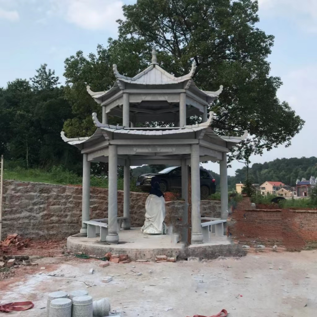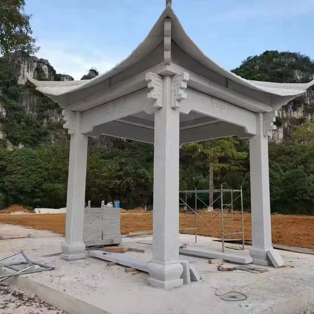 Stone pavilions are traditional landscape structures that blend the artistic conception of Chinese gardens with practical functions. Designed around the core concept of "a pavilion is a place to stop," they offer both the practical values of "sheltering from the sun and rain, and taking a moment to view the scenery" and the aesthetic philosophy of Chinese architecture, which emphasizes "delicacy, compactness, and harmony with nature." They often feature intricate combinations of columns, beams, and roofs (such as upturned and sloping roofs) and are adorned with bas-reliefs and openwork carvings of flowers, landscapes, and auspicious patterns, making the buildings themselves a highlight of the scenery. In terms of materials, they predominantly use high-quality stones like bluestone, granite, and marble. Bluestone brings an ancient, smooth texture, fitting well with traditional garden styles, while granite's high hardness and resistance to weathering and wear make it suitable for long-term outdoor use. Marble's pure color enhances the building's refinement. The production process involves site selection and design (determining dimensions and shapes based on the surrounding environment), stone processing (cutting and finely carving components after shaping), and assembly (using mortise and tenon joints or reinforced steel to ensure structural stability). Craftsmen adjust the pavilion's specifications (such as four-column or six-column pavilions) based on the usage scenario to ensure they meet functional needs while harmonizing with the environment. Their applications are versatile, from garden courtyards as resting and viewing spots for visitors to park lakesides and mountain paths providing shade and shelter. They can also be used in ancient architecture parks or cultural scenic areas to restore traditional landscape features and convey the charm of historical culture. They can also grace private gardens, enhancing the elegance of the space. With high-quality stones and rigorous craftsmanship, stone pavilions offer advantages such as resistance to wind and rain erosion, aging resistance, and long service life, requiring minimal maintenance. They not only satisfy the practical needs of resting and viewing but also inject the elegant artistic conception of Chinese gardens into the scene, making them an important carrier for landscape creation and the inheritance of traditional architectural culture.