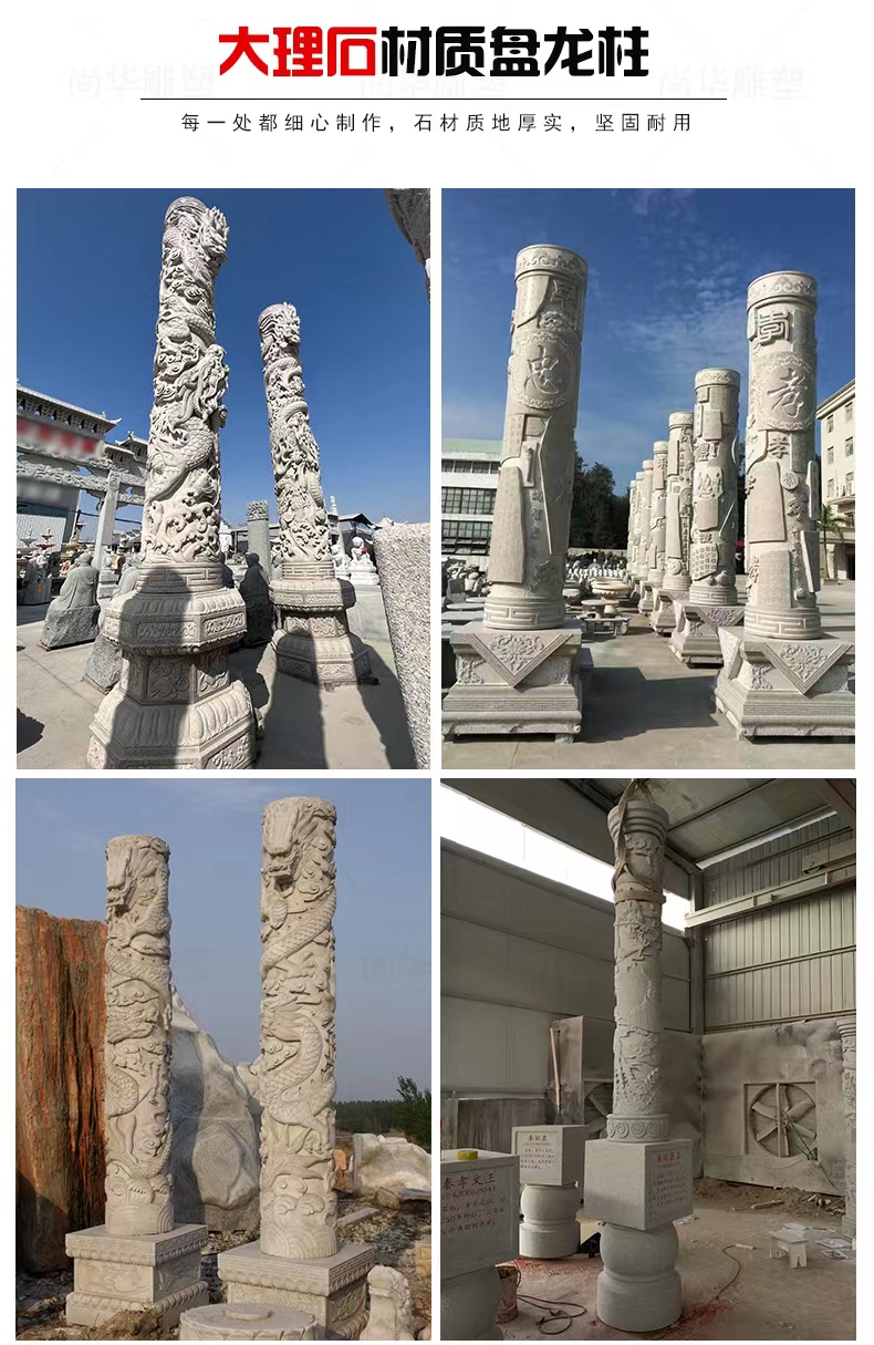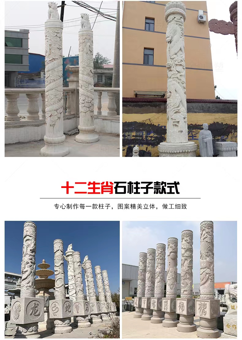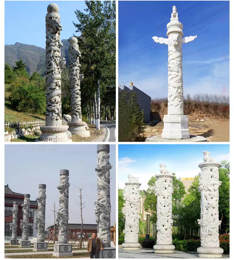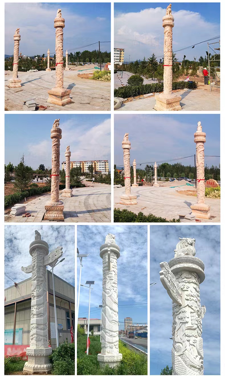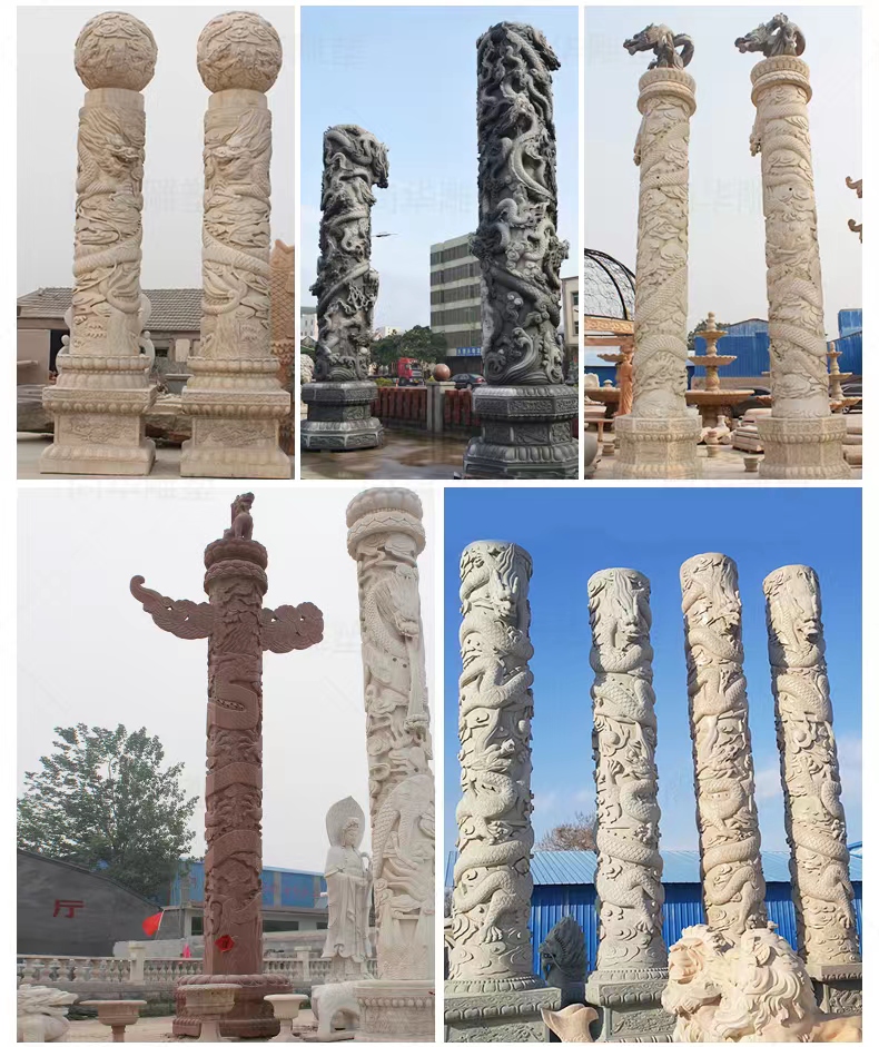 Jining Dahui Stone Industry, rooted in Jiaxiang, the "Hometown of Stone Carving," has passed down the 1,000-year-old craftsmanship to create exquisite stone dragon columns, a perfect blend of culture and art. Selected high-quality stone materials such as Shandong Tianqing Stone, known for their resistance to weathering and sturdy texture, are meticulously processed through the entire process of selecting raw materials, shaping rough drafts, fine carving, and polishing installation, ensuring both structural stability and artistic tension. The dragon patterns on the column follow the ancient method of "The Dragon Divided into Nine Similarities," presented with diverse techniques like bas-relief and openwork, showcasing classic styles such as a single dragon coiling around the column and two dragons playing with a pearl. The dragon's head is majestic, the body strong, and the scales and whiskers are finely detailed. Accompanied by auspicious patterns like auspicious clouds and lotus flowers, these columns not only embody the traditional connotations of imperial dignity and sacred protection but also carry the beautiful wishes for blessings and longevity. Whether in temples, ancestral halls, squares, gardens, or memorials, these dragon columns illuminate the space with their grandeur, becoming carriers of national cultural memory and heritage.