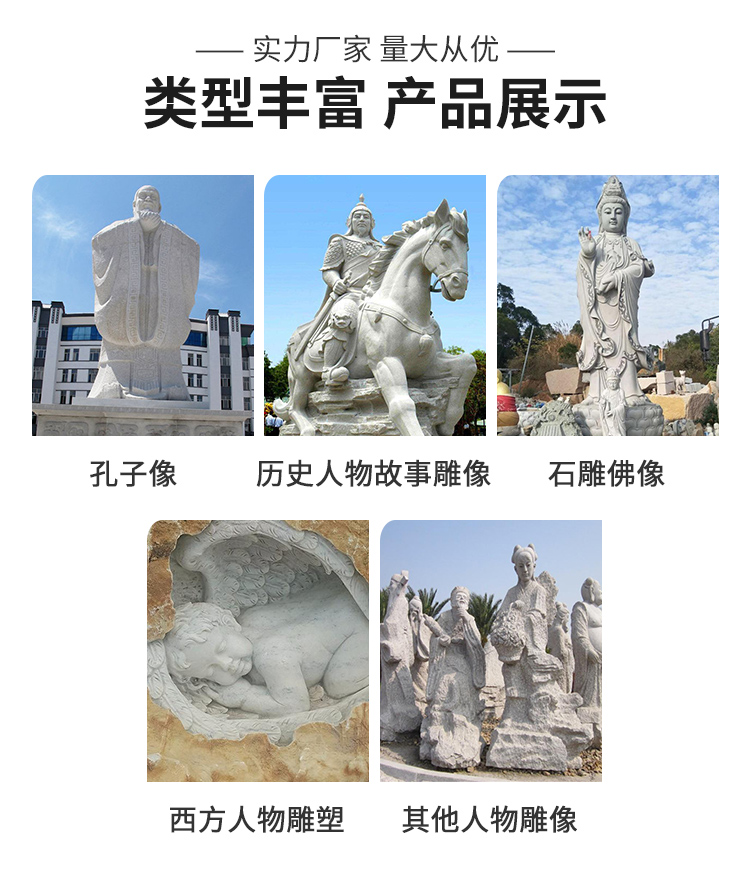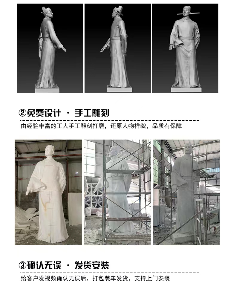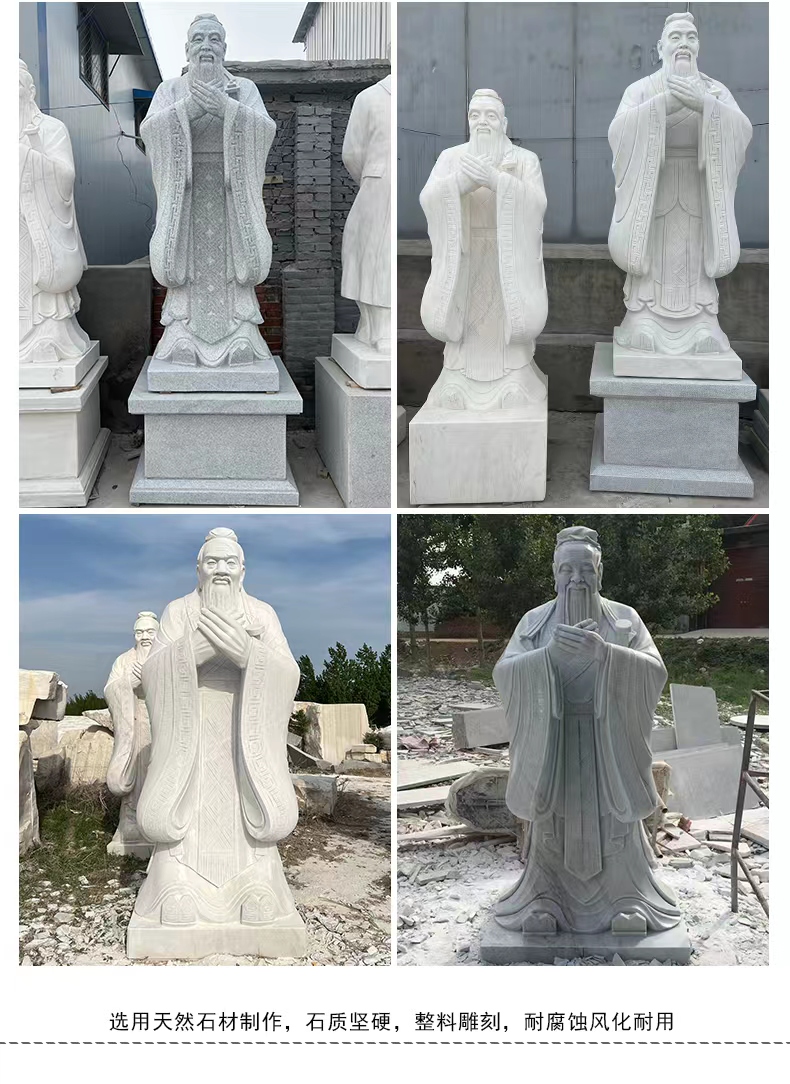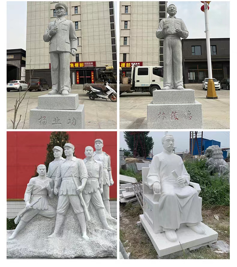 Figurine sculptures are artistic products that combine expressive artistry with cultural significance, capable of restoring the appearance of historical figures, conveying the spirit of the times, shaping folk images, and expressing emotional attachments. They often showcase the characters' expressions, actions, and details through techniques like round relief, bas-relief, and openwork, deeply integrating sculpture skills with humanistic connotations, and offering both aesthetic and intellectual appeal. In terms of material choice, they predominantly use materials like grey stone, granite, white marble, and bronze. Grey stone is suitable for presenting an ancient texture and fine carving, granite is hard and resistant to outdoor environmental erosion, white marble has a pure color that highlights the subtle texture of the figures, and bronze naturally carries a sense of heavy history and exhibits a unique metallic texture. The production process involves conceptualization, character design, model making, stone or metal processing, fine carving, and surface treatment, with artisans adjusting techniques based on the character's features and material properties to ensure lively and three-dimensional figures with precise emotional expression. Their applications are vast, from urban squares to create monumental figures that embody the city's spirit, to scenic spots to enrich the tour experience with natural and cultural landscapes, to school environments to showcase the风采 of famous figures and inspire student growth, and even to courtyards and museums to add cultural ambiance and artistic flair. Thanks to their high-quality materials and exquisite craftsmanship, figurine sculptures offer the advantages of resistance to weathering, wear, and long lifespan. They can serve as cultural symbols to pass on history and spirit, as well as artistic decorations to elevate spatial elegance, making them classic products that combine artistic and practical value.