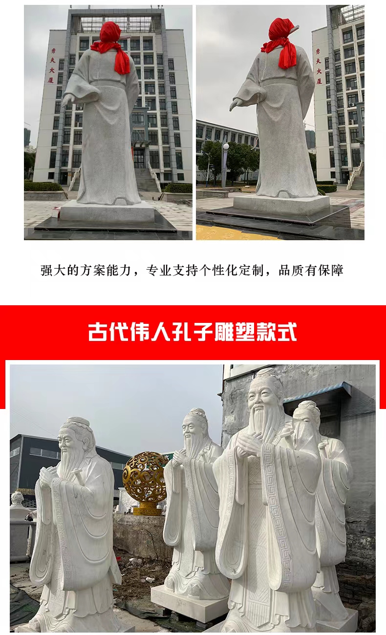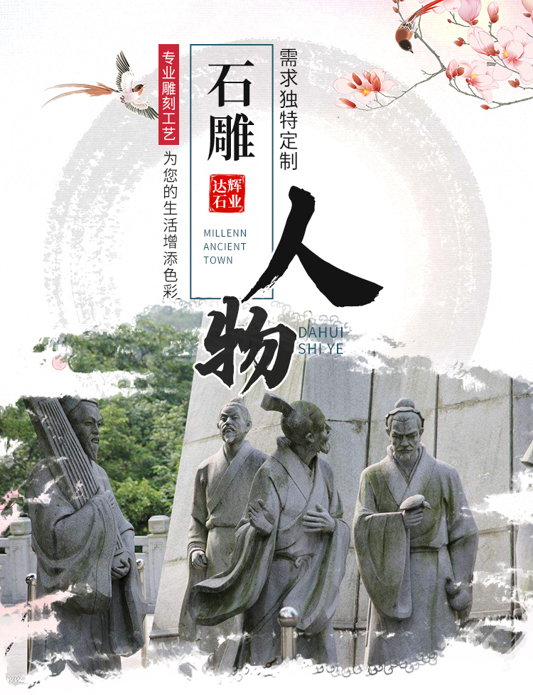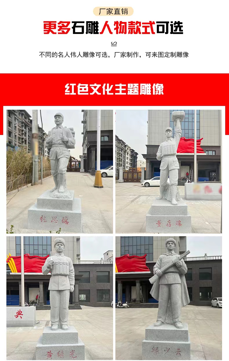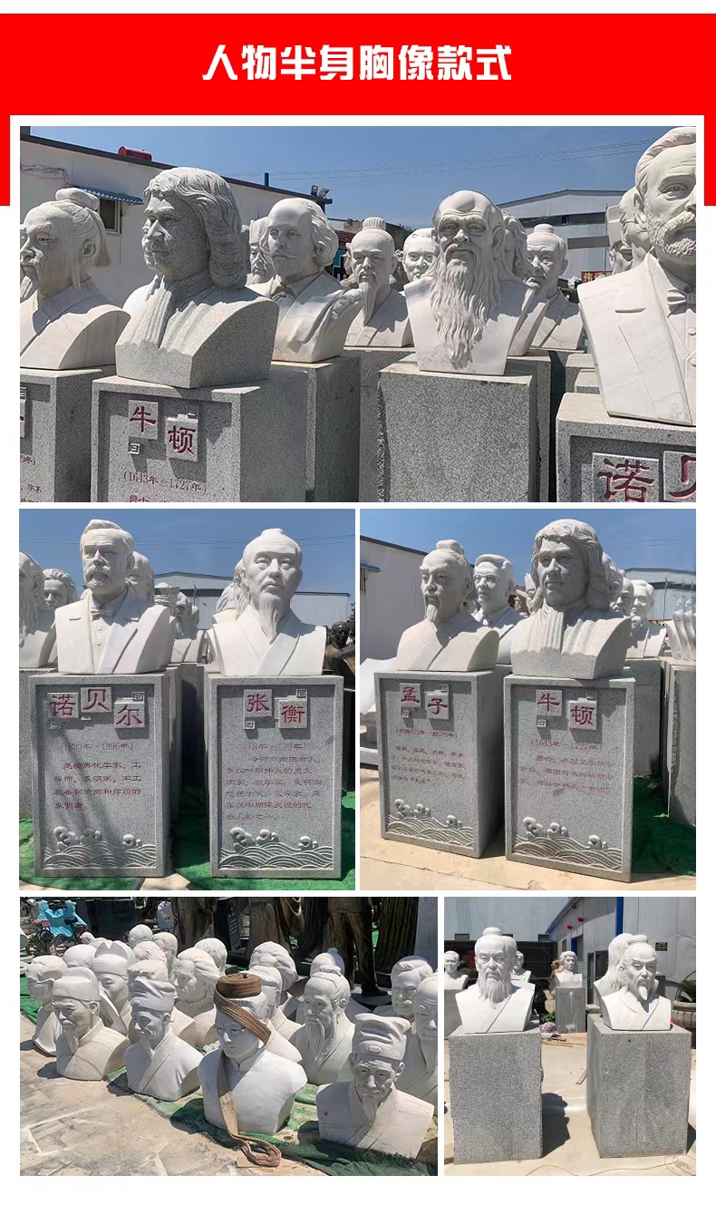Figurine sculptures are artistic products that combine expressive artistry with cultural significance, capable of restoring the appearance of historical figures, conveying the spirit of the times, shaping folk images, and expressing emotional attachments. They often showcase the characters' expressions, actions, and details through techniques like round relief, bas-relief, and openwork, deeply integrating sculpture skills with humanistic connotations, and offering both aesthetic and intellectual appeal. In terms of material choice, they predominantly use materials like grey stone, granite, white marble, and bronze. Grey stone is suitable for presenting an ancient texture and fine carving, granite is hard and resistant to outdoor environmental erosion, white marble has a pure color that highlights the subtle texture of the figures, and bronze naturally carries a sense of heavy history and exhibits a unique metallic texture. The production process involves conceptualization, character design, model making, stone or metal processing, fine carving, and surface treatment, with artisans adjusting techniques based on the character's features and material properties to ensure lively and three-dimensional figures with precise emotional expression. Their applications are vast, from urban squares to create monumental figures that embody the city's spirit, to scenic spots to enrich the tour experience with natural and cultural landscapes, to school environments to showcase the风采 of famous figures and inspire student growth, and even to courtyards and museums to add cultural ambiance and artistic flair. Thanks to their high-quality materials and exquisite craftsmanship, figurine sculptures offer the advantages of resistance to weathering, wear, and long lifespan. They can serve as cultural symbols to pass on history and spirit, as well as artistic decorations to elevate spatial elegance, making them classic products that combine artistic and practical value.