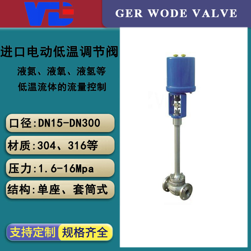 Germany VordWODEImport electric low-temperature regulating valve is made of 3810、PSL、2SBSeries of electric actuators and ultra-low temperature regulating valve bodies are composed. The actuator contains feeding function and accepts unified4-20mAOr1-5V·DCStandard signal, converting current signals into corresponding linear displacements, automatically controlling the opening of the regulating valve to achieve continuous adjustment of process parameters such as pressure, flow rate, temperature, and liquid level within the pipeline. Electric low-temperature regulating valves are suitable for temperatures below0~-250Operates at °C, comprising an electric actuator and a valve body with a long neck pipe. The purpose of the long neck pipe is to enable the valve stem to seal at near room temperature and reduce the transmission of external heat energy. To minimize transmission, the long neck is designed with a thin-walled structure.Section 2: Imported Low-Temperature Electric Regulating Valve Key Technical Parameters
