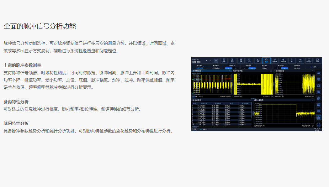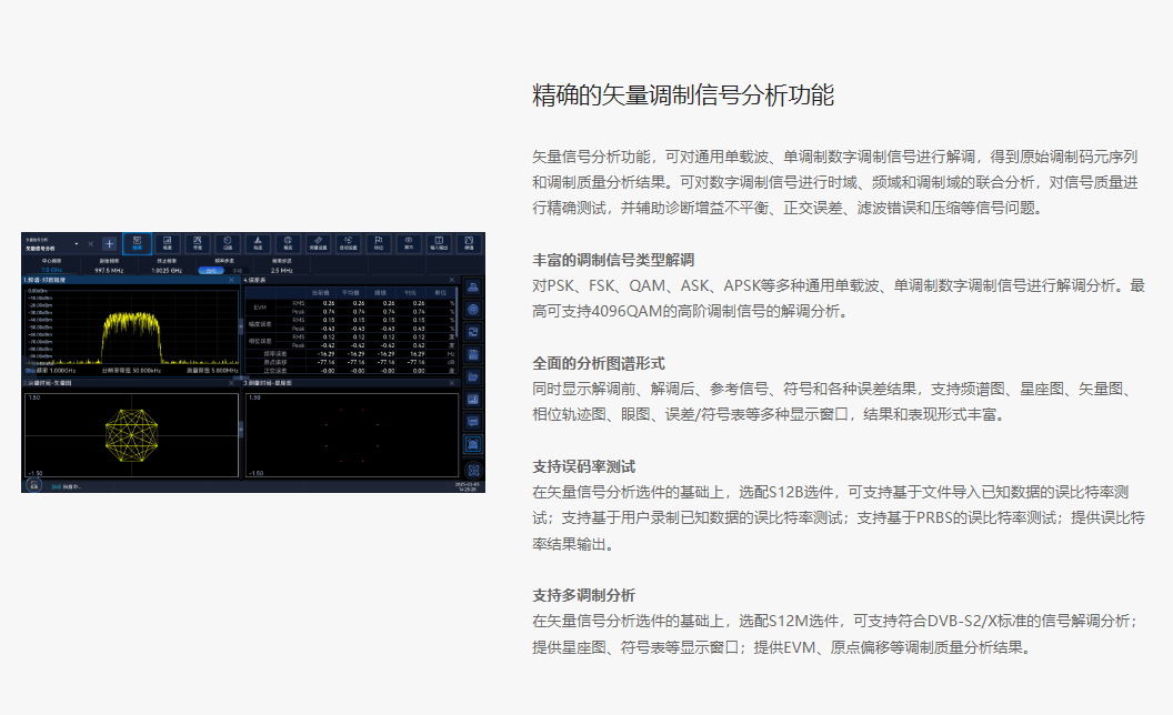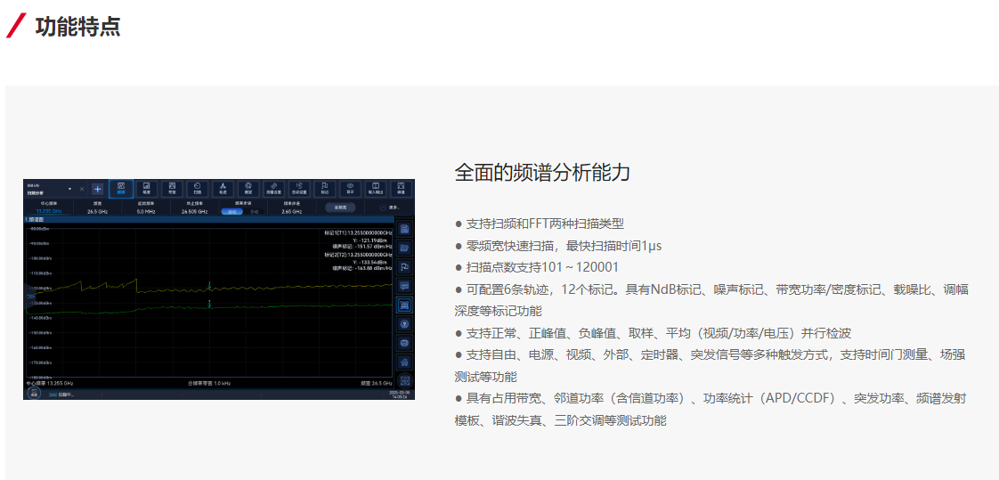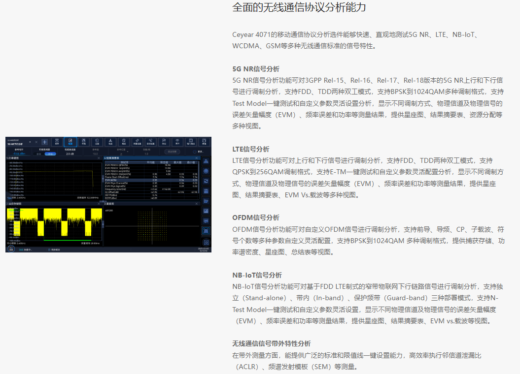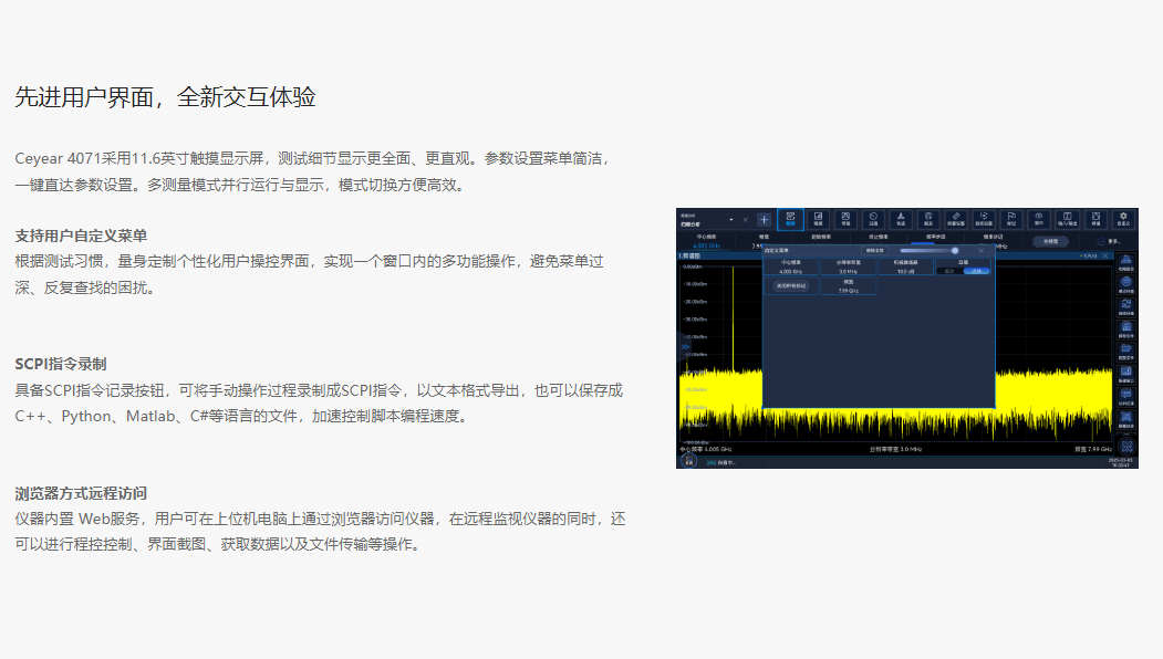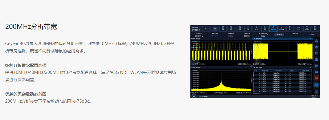 The Ceyear 4071 features excellent test dynamic range, phase noise, amplitude accuracy, and testing speed, offering a rich set of testing functions including spectrum analysis, I/Q analysis, real-time spectrum analysis, transient analysis, vector signal analysis, and pulse analysis.