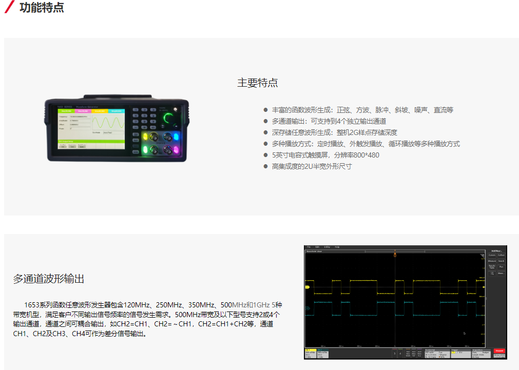 The 1653 series arbitrary waveform generator is a dual-channel (up to 4 channels with 500MHz support), multifunctional arbitrary waveform generator with a digital-to-analog sampling rate of 2.4GSa/s and vertical resolution of 16bits (1653AB-AE) / 2.5GSa/s and 14bits (1653AF). The output bandwidth includes configurations of 120MHz, 250MHz, 350MHz, 500MHz, and 1GHz. The maximum waveform storage depth of the entire unit is 2G samples. It can perform conventional function waveform generation, pulse waveform generation, arbitrary waveform generation, noise, modulated signal generation, I/Q vector baseband signals, and more. It supports various signal modulation methods, timing playback, external trigger playback, loop playback, customizable number of playback times, and channel synchronization functions. It also supports hardware frequency counter capabilities.