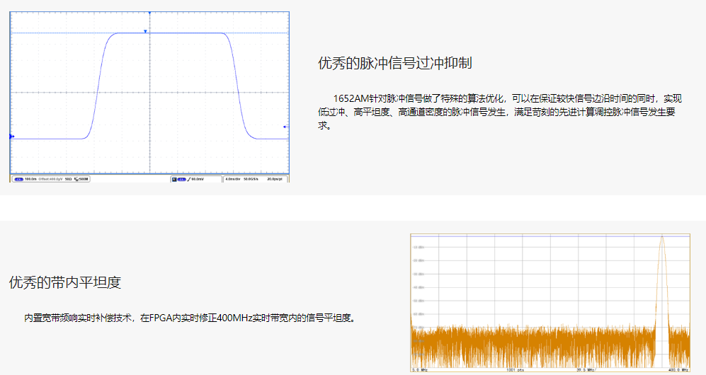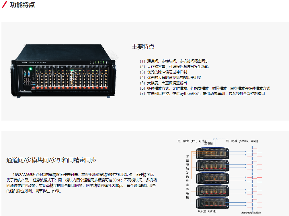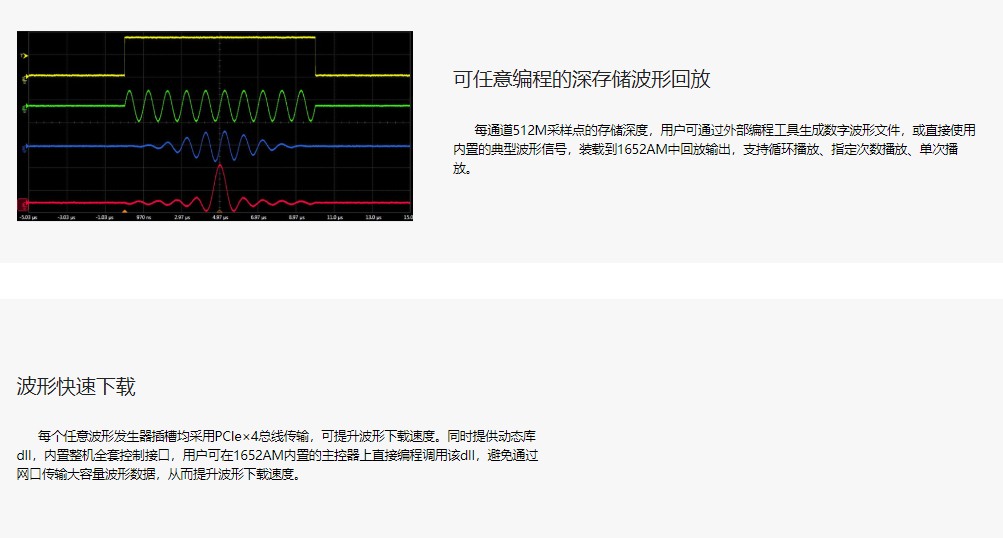 The 1652AM standard configuration includes 4 channels, with a maximum of 64 channels available per unit based on customer requirements. All channels can be precisely synchronized for output, and the signal output delay can be accurately adjusted. Multiple units also feature a synchronization mechanism that maintains precision. Each channel has a 512M sample point storage depth, is programmable independently, and can perform functions such as generating conventional function waveforms and editing arbitrary waveforms. The arbitrary waveform playback supports timed playback, external trigger playback, and loop playback, with the number of playback times definable.