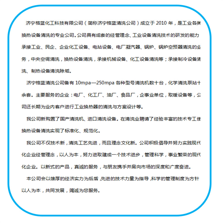 Jining Green Chemical Technology Co., Ltd. (简称 Jining Green Cleaning Co.) was established in 2010 and is a professional company specializing in the cleaning of various industrial heat exchange equipment. The company boasts comprehensive business philosophy and the capability to research and develop industrial cleaning technologies. We undertake cleaning services for industrial, private enterprise, corporate chemical equipment, power station equipment, power plant condensers, boilers, and boiler air preheaters; as well as air conditioning and heat exchange equipment cleaning. We also handle cleaning of mechanical and chemical equipment, and provide services for cleaning refrigeration and heating equipment to remove scale.