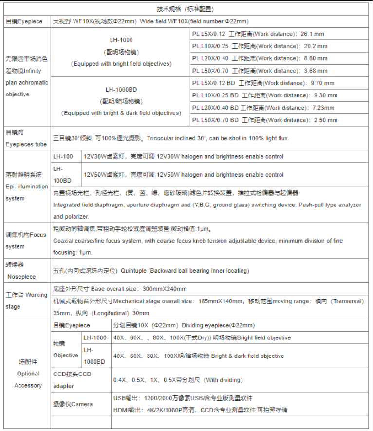 The LH-1000/LH-1000BD industrial inspection microscope is designed for microscopic observation of the tissue structure and geometric shape of workpiece surfaces. Featuring an excellent infinite conjugate optical system and modular design concept, it allows for easy system upgrades and functionalities such as polarized and dark field observation. The guide column elevation device enables quick adjustment of the distance between the workbench and objective lens, suitable for inspecting workpieces of varying thickness. The mechanical moving stage ensures precise positioning of the workpiece observation area. The focusing mechanism uses cylindrical roller guidance transmission for smooth elevation. This product is suitable for inspecting precision parts, integrated circuits, packaging materials, and other products.