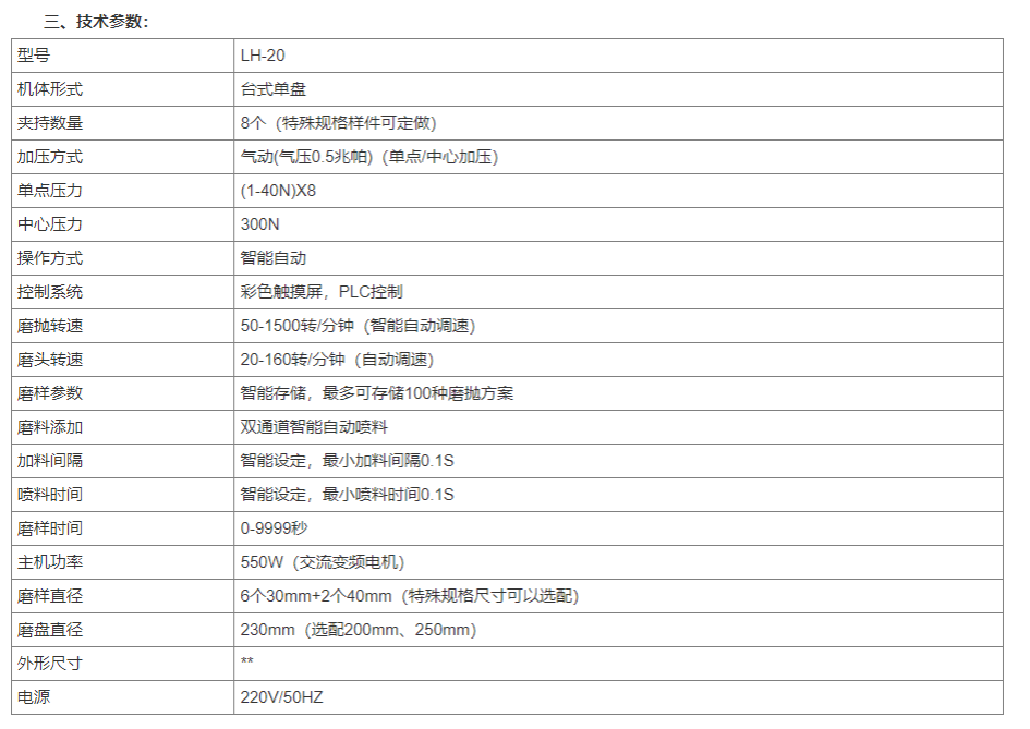 The LH-20 series intelligent automatic metallographic grinder-polisher is an air-operated model, featuring an 8-inch color touch screen PLC control. It is equipped with a dual-channel automatic abrasive addition system, where the PLC controls the intelligent spray addition of abrasives. It automatically adjusts the grinding pressure and time, and stores the current grinding-polishing program. Additionally, it can process eight specimen blocks, and with optional special fixtures, it can perform precise grinding and polishing on blocks of special specifications and dimensions.