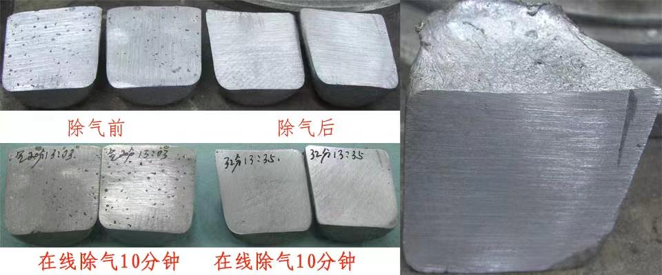 2. De-gassing is achieved by controlled rotation of a graphite shaft and impeller to stir the aluminum melt, while a measured amount of inert gas is pressurized and dispersed into the melt by the impeller, forming tiny bubbles that uniformly distribute throughout the molten metal with zero gas partial pressure. Due to the high hydrogen partial pressure in the aluminum melt, hydrogen gas continuously diffuses into the bubbles. Meanwhile, some non-metallic inclusions in the aluminum melt adhere to the bubble surfaces. These inert gas bubbles containing unwanted hydrogen and a portion of non-metallic inclusions rise to the surface of the liquid to achieve the de-gassing effect.
