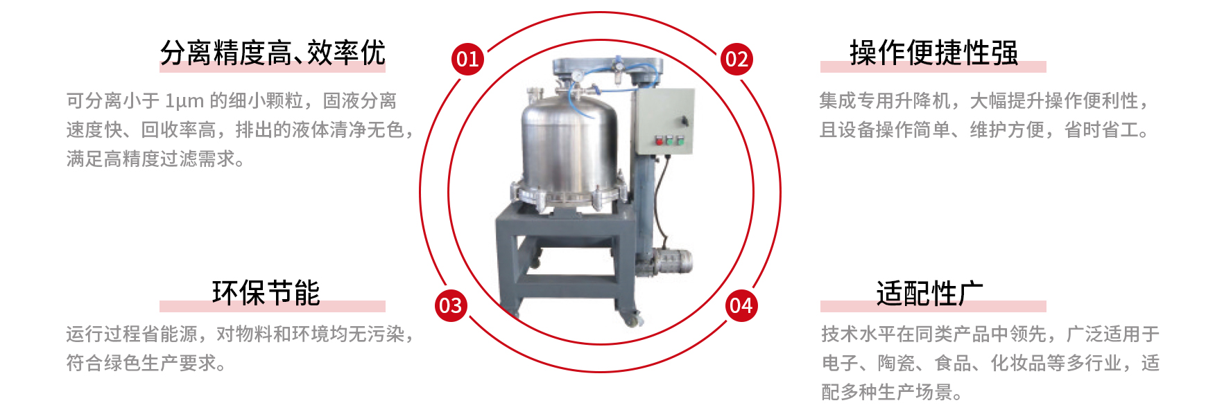 The equipment is widely used in industries such as electronics, ceramics, food, and cosmetics. It is easy to operate, convenient to maintain, time and labor-saving, energy-efficient, and does not cause pollution to materials or the environment.