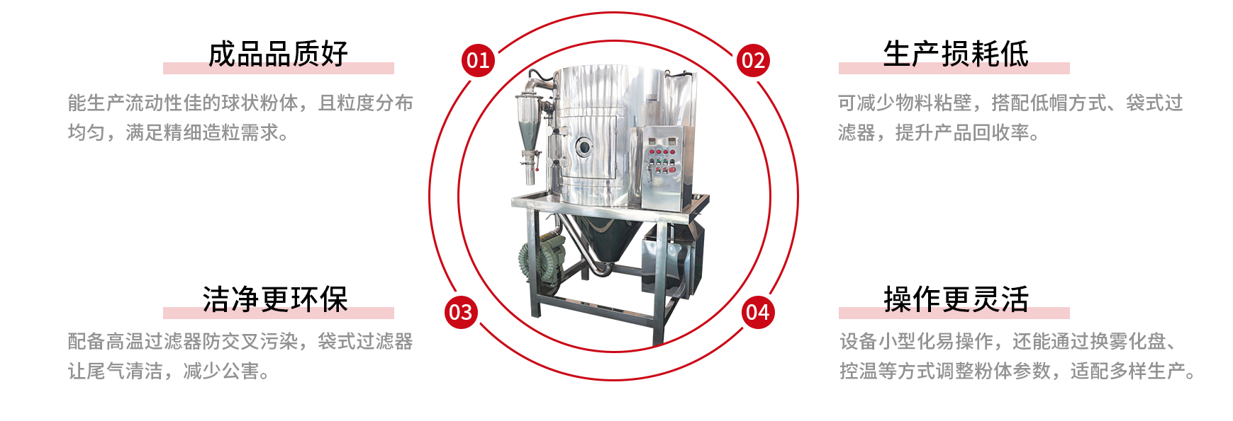 The centrifugal spray dryer is a type of continuous atmospheric pressure dryer. It atomizes the liquid material into misty droplets at high speed through an air or electric atomization device, allowing it to be instantaneously dried upon contact with hot air in the drying chamber. It is widely used in industries such as electronics, ceramics, magnetic materials, battery materials, food, medicine, and chemicals.