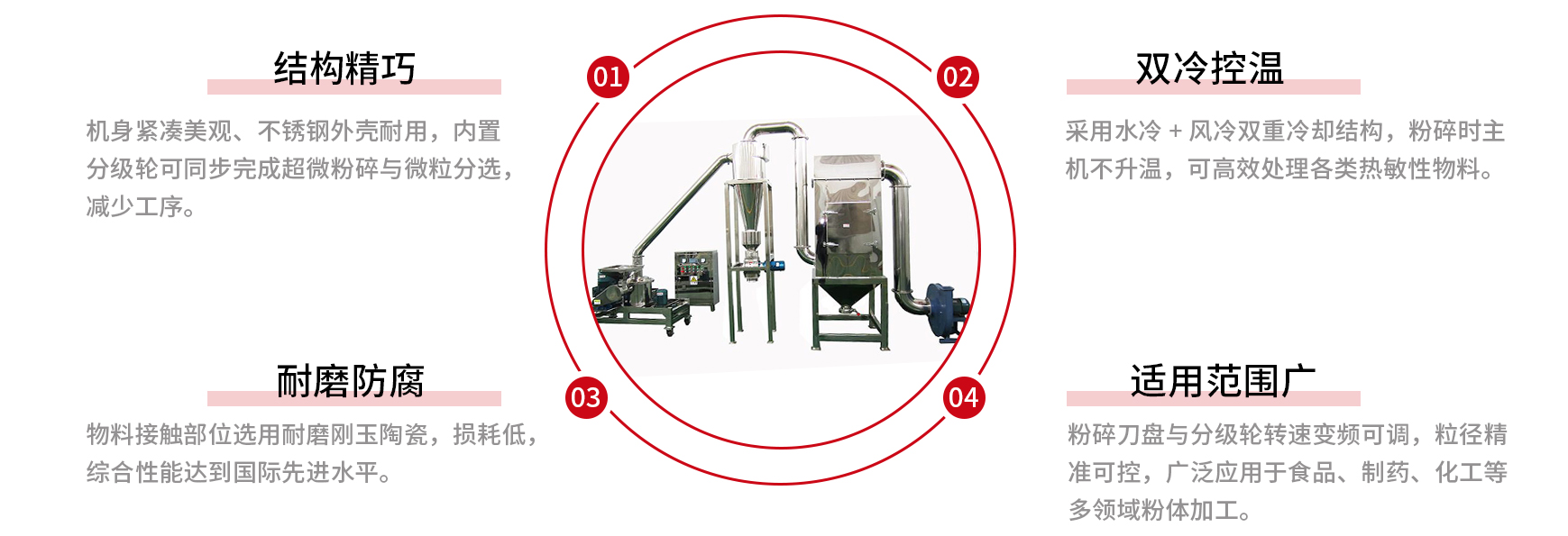 The ultra-fine mill features a compact and aesthetically pleasing design, with a stainless steel housing and an internal grading wheel for simultaneous ultra-fine grinding and particle sorting. Equipped with dual water cooling and air cooling, the main unit does not overheat during operation, allowing for the processing of heat-sensitive materials. The material contact areas can be optionally fitted with abrasion-resistant corundum ceramic, achieving comprehensive performance at an international advanced level. It is widely used in the powder processing of various fields such as food, pharmaceuticals, and chemicals.