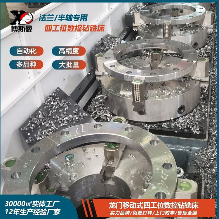 High Precision 4-Station CNC Flange Drilling Machine: The Bossman 4-Station CNC Drilling and Milling Machine is primarily used for the processing of annular flange parts. It can also efficiently perform drilling, threading, countersinking, and milling operations on workpieces such as half shafts, plates, rings, etc., within the effective thickness range. It is capable of drilling through holes and blind holes in both solid material and composite material components. The machine's processing is digitally controlled, making operation very convenient. It can achieve automation, high precision, a variety of products, and large-scale production.
