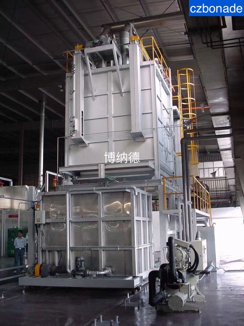 Fully automatic vertical quenching furnace, including a movable quenching water tank, loading station for vertical aluminum alloy quenching furnace to perform solution heat treatment, followed by rapid quenching. Especially for thin-walled aluminum components, it is crucial to ensure that the quenching delay time from opening the door to complete immersion in the quenching tank is only 5 seconds. Typically, only this furnace model can meet these stringent requirements. This vertical quenching furnace is mounted on a base, allowing a quenching tank to be placed directly beneath. For quenching, the bottom moves horizontally to one side, and a load box with parts is lowered into the quenching tank using a lifting unit integrated into the furnace. Operation can be controlled automatically or semi-automatically. Due to the wide temperature working area, vertical equipment can complete the entire T6 heat treatment process in the furnace, including solution heat treatment, quenching, and artificial aging.