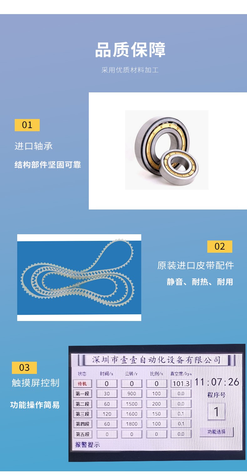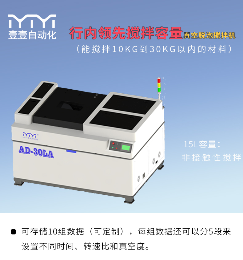 AD30LA High Capacity (mixes materials from 10kg to 30kg); while rotating, it can simultaneously mix and vacuum-seal the materials within 2-5 minutes with an optional high-power vacuum pump; equipped with various clamps and cups, it can easily handle materials from 10kg to 30kg, meeting all requirements from experiments to mass production.