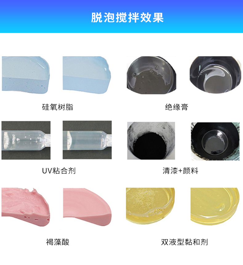 Suitable for medium to high viscosity materials such as phosphorescent powder, glue, silicone, silver paste, aluminum paste, adhesives, inks, silver nanoparticles, silver nanowires, conductive silver adhesive, insulating adhesive, battery paste, etc. It can uniformly stir from liquid to solid, liquid to liquid, and solid to solid substances. Free samples and trial machines are available, and it supports degassing and stirring using standard syringes/pots and non-standard syringes/pots.Contact customer service for detailed information! Place a sample order and test the machine immediately.